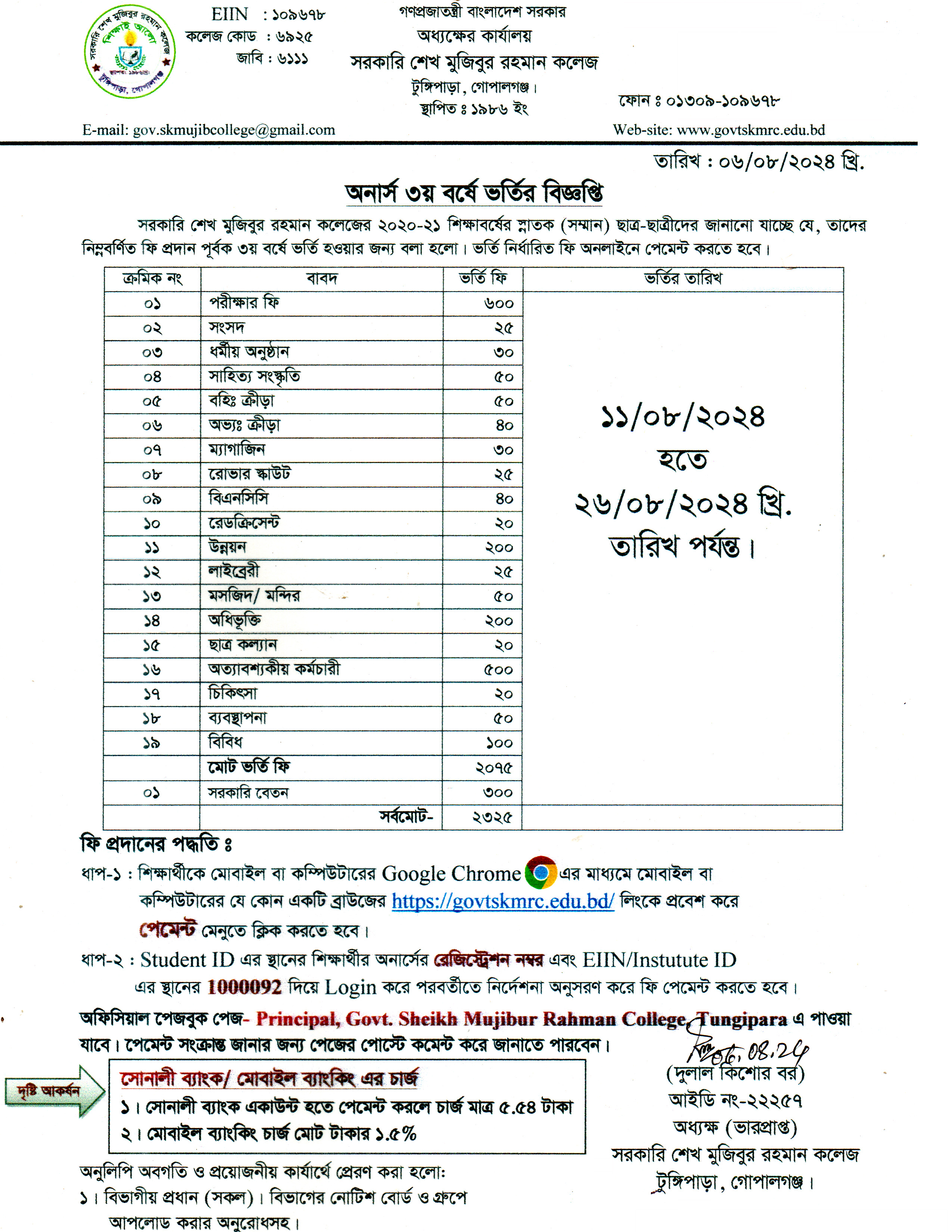 অনার্স ১ম বর্ষের ভর্তির জন্য ২য় পর্যায়ের আবেদন ফি ৩৫০/- জমার দেয়ার বিজ্ঞপ্তি। রকেটে টাকা পাঠালে তার আবেদন নিশ্চয়ন করা হবে না।